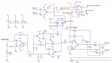After the filter, the signal is passed through an envelope detector to get an envelope of the signal and a threshold. The first stage of the envelope comprises an op-amp and diodes, which function as a half-wave rectifier. The second stage is a simple low-pass filter that is less than the carrier frequency of the envelope detector but large enough to pass the envelope. Creating a 5 kHz low-pass filter works great for these requirements. The third state is also a low-pass filter that only passes the DC value of the envelope pass. A low-pass filter of less than 100 Hz but greater than 10 Hz effectively passes the threshold. The half-wave rectifier inverts the signal and changes all positive values of the signal to zero to make the signal similar to the output of the PSG. The output of the envelope detector is the envelope of the signal and the threshold value.