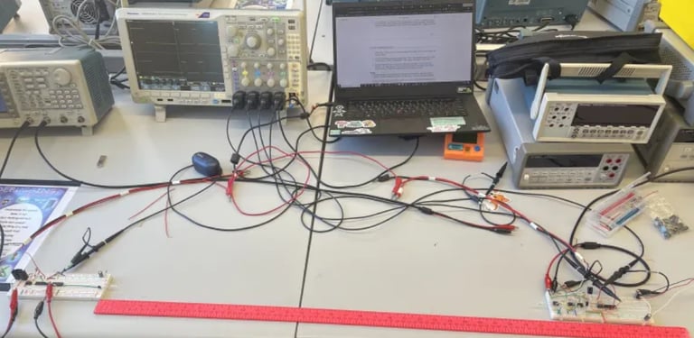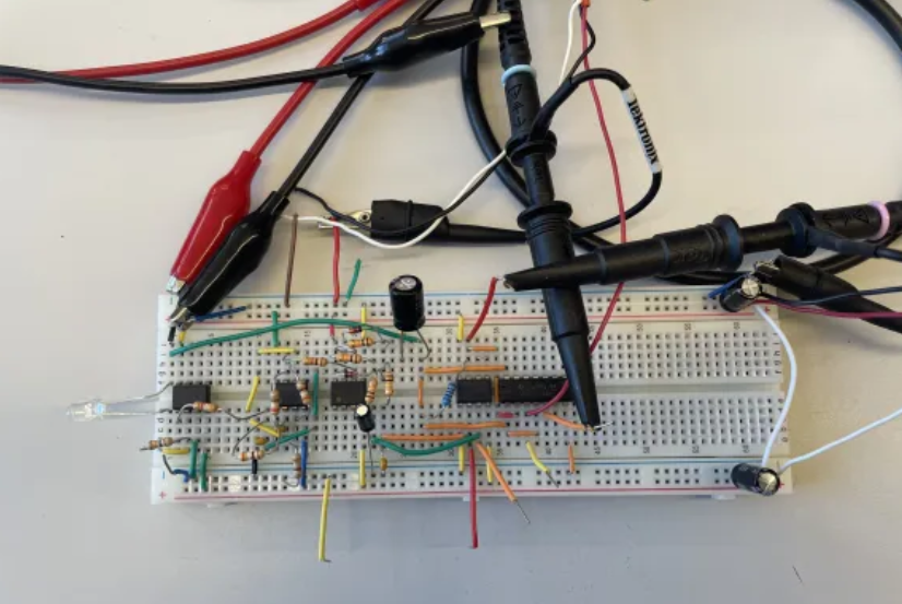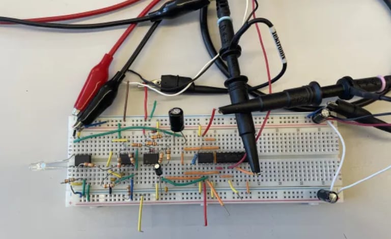 This was a project for a communication systems course, to apply the concepts learned in class. Overall, with all the parts integrated and tested, the transmitter and receiver circuit properly sent and received the pseudorandom bit sequence without errors, up to a distance of 32 inches between the two breadboards. Even the recovered bit clock on the receiver circuit is extremely accurate, where the D Flip-Flop can receive accurate bits up to 3.9kHz clock speed.
