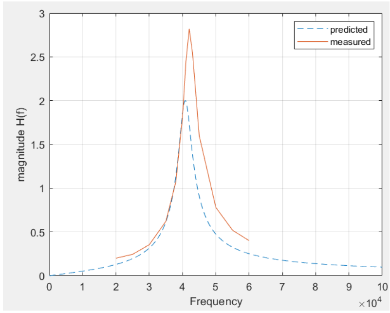 The above is a picture showing the calculation for the bandpass filter design, as well as a graph comparing the measured and predicted frequency response. The actual bandpass filter is shifted to the right of the frequency bands and has a broader passband, but it still passes the carrier frequency at 40 kHz.