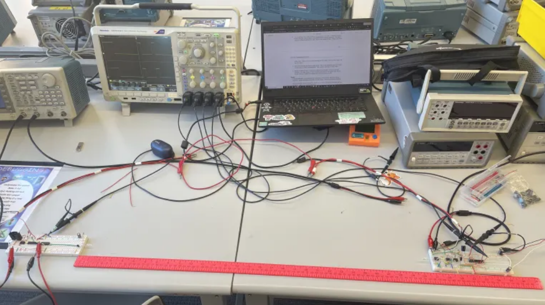 There were a few rough spots in the process of building all the subsystems. The voltage regulator we made worked well for the first half of the lab; however, when we were wiring up the envelope detector, the voltage regulator burnt out as we realized the wall adapter was sourcing 12VDC to the regulator instead of 9VDC. We rectified this by running it off the power supply instead. We also discovered that for the dual-amplifier bandpass subsystem we built, the capacitor value of the low-pass filter was too small, as there was still a large portion of the 40kHz carrier present when going into the envelope detector. We also messed up on a later part of the lab where we clocked the carrier oscillator with the frequency of the bit clock, not the 40kHz. Thus, the output of the bandpass filter was not the expected output.