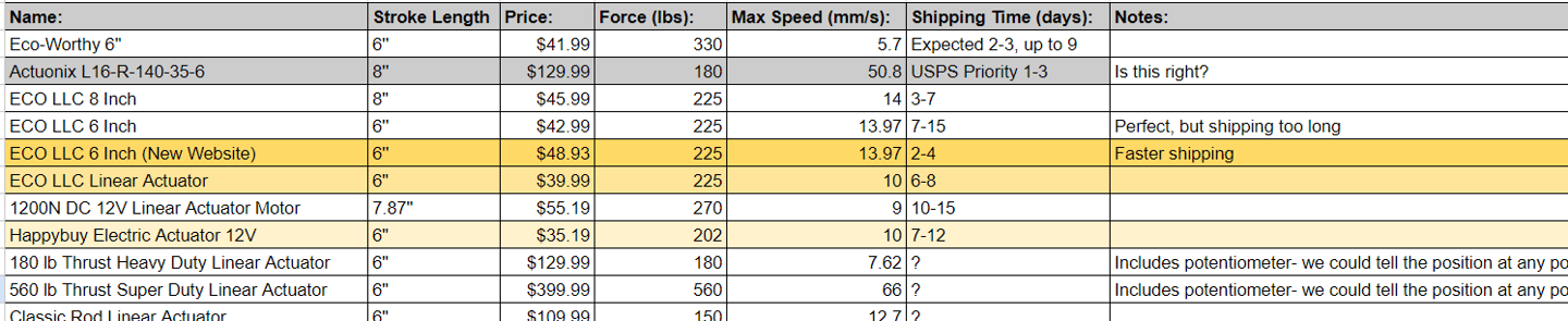 Originally, we had no idea how to implement a linear actuator to work in the arm. While we knew it could handle the load, the problem was balancing the speed of the actuator, the load capacity, the price, and the shipping time as we had a two-week deadline. The trade-off of having linear actuators is usually the speed v.s. the torque of the motor spinning the lead screw and by extension the force it could exert. We also didn't want the stoke length to be too long or it would be awkward to have it attached to an arm.