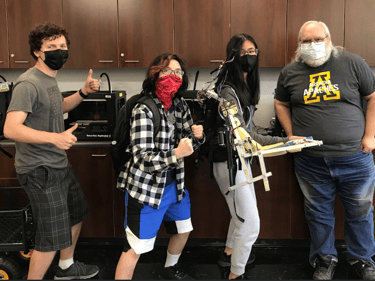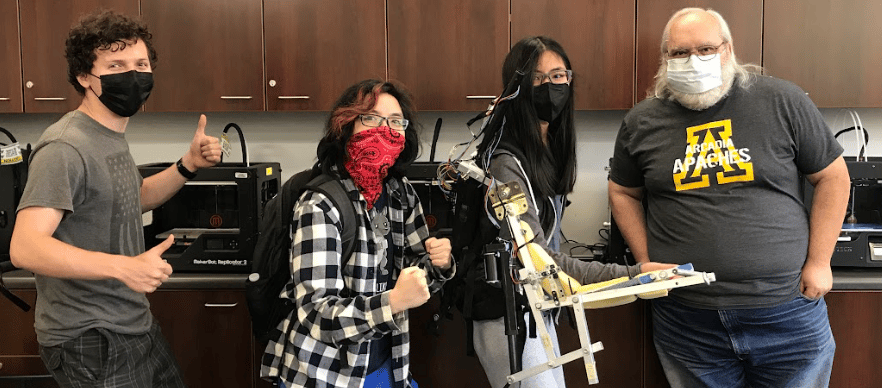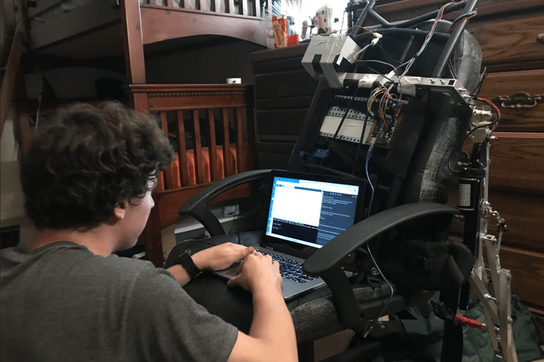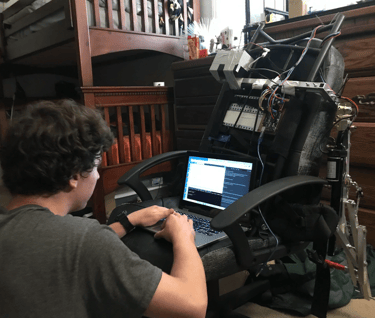 Here Trevor is programming the exo-arm in the optimal position. And yes we just duct-taped the lead acid battery on the frame. We needed a place to put it and we happened to need a counterweight on the other side as we were only building one arm, so it all worked out. Below is the GitHub repo of the code.