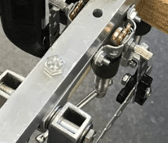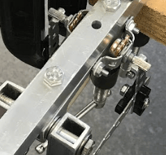This is a close-up of the elbow joint. Notice the two potentiometers and how they pivot based on the thin metal support joints. These are just VEX robotics pieces we had lying around the workshop. The nob of the potentiometers just so happened to be the size of the square holes on the steel VEX bars. These potentiometers would be hooked up to a microcontroller on the backpack frame. They were used to know when to power the linear actuator and in what directions based on the angle of the manual arm compared to the drive arm.