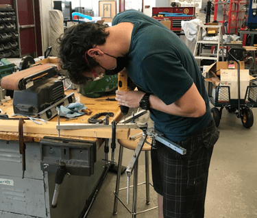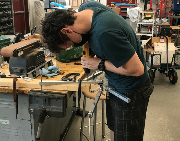 Here, Trevor is drilling holes into the drive arm to attach the linear actuator