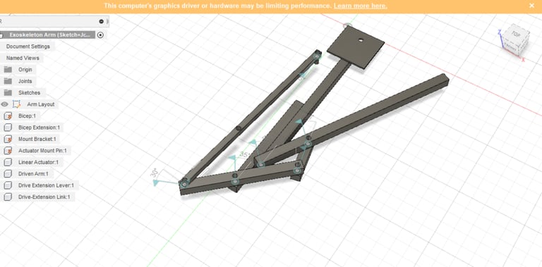We started off with a very broad idea of what we wanted the arm to look like. The exo-arm consists of a base arm attached to the user's upper arm via straps at the bicep, a manual arm attached to the user's lower arm via straps at the wrist, and the drive arm where the linear actuator is attached. Both the manual and drive arms would pivot off the elbow joint. The drive arm would match the manual arm via the linear actuator and theoretically, bear most of the load that the manual arm normally would've.