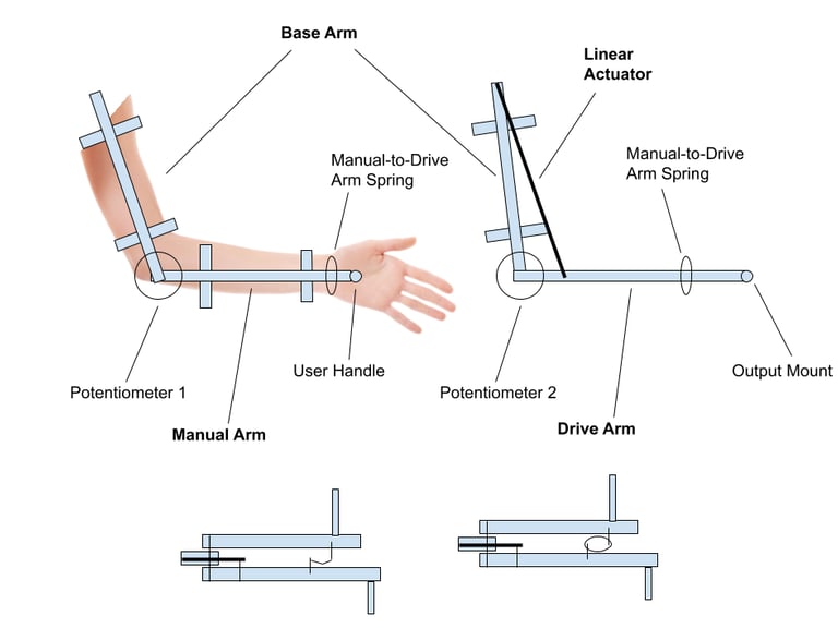 We knew we wanted the movement of the linear actuator to be dictated by the angle the user's arm was in, so we implemented potentiometers at the elbow joint. We also added a spring to keep the drive arm attached to the manual arm.