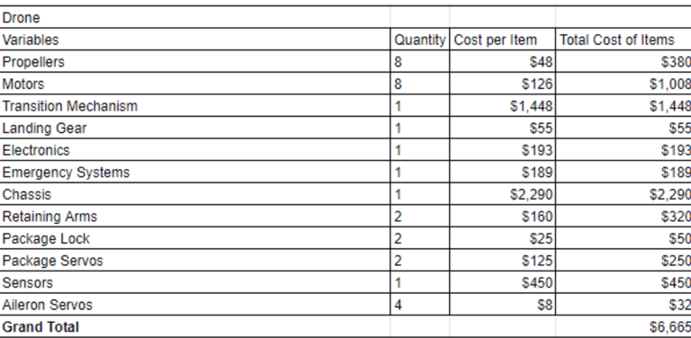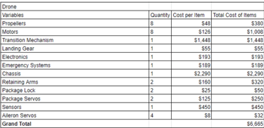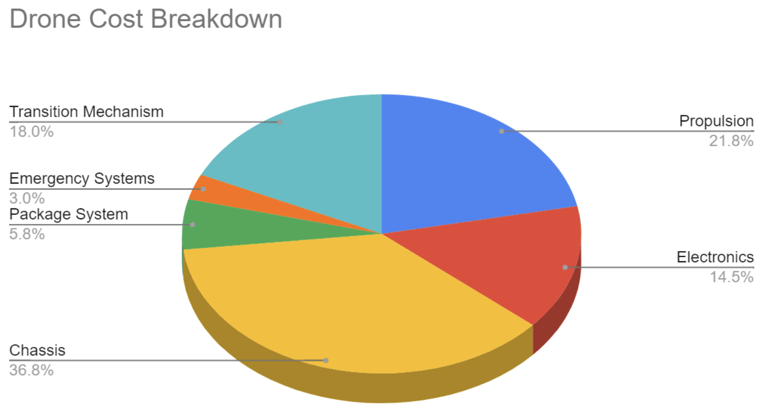 Pie Chart and component table of the estimated cost of the package delivery UAVs.