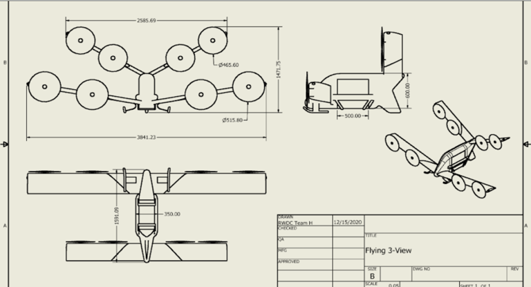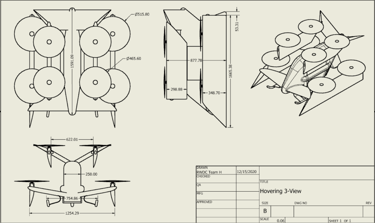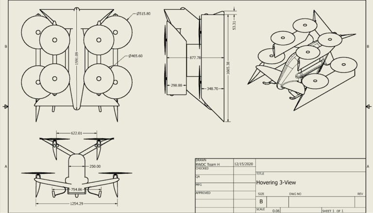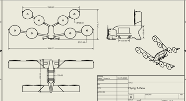 Three View Diagram of the final designs, both in the hovering and flying orientation