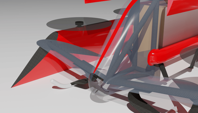 Here is a render of the finalized CAD with the frame exposed for visualization purposes. The sensor suite, including a LiDAR camera would be mounted to the nose of the aircraft for guidance and navigation control