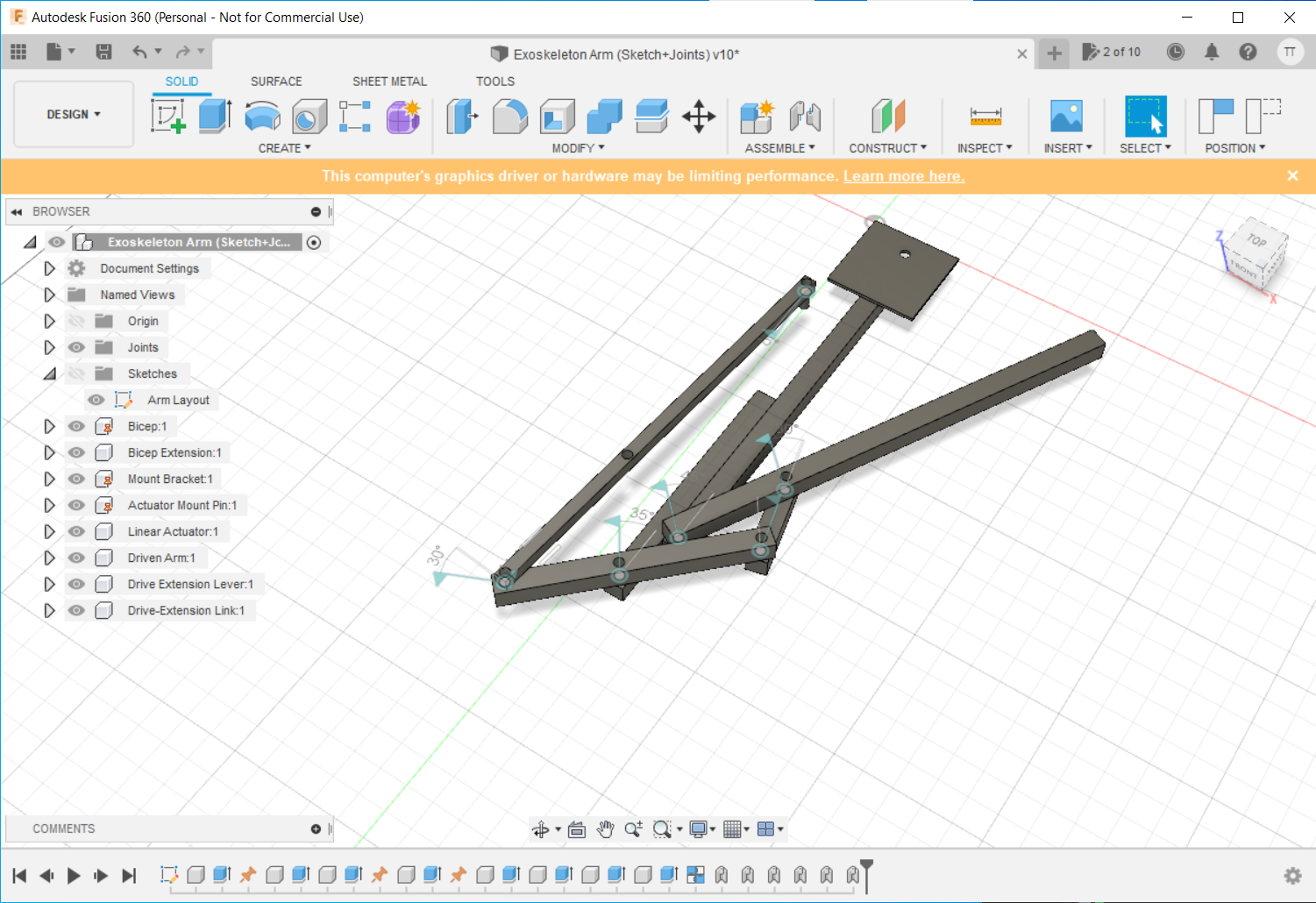 We ended up 3D modeling the arm to get a better sense of how the different parts would move. We added two more metal bars to extend the range of the linear actuator and better support the drive arm